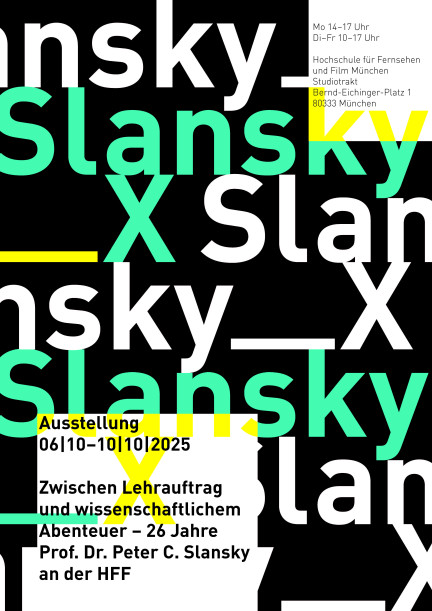 Vom 6. bis 10. Oktober 2025 ist an der HFF München die Ausstellung „Slansky_X | Zwischen Lehrauftrag und wissenschaftlichem Abenteuer – 26 Jahre Prof. Dr. Peter C. Slansky an der HFF“ zu sehen. Gezeigt werden 26 + 2 thematische Stationen, die Einblicke in Lehre, Forschung in Medientechnologien, Planungen zum HFF-Neubau sowie zur technischen Ausstattung geben. Darüber hinaus werden die Wettbewerbe zur KI-Forschungsprofessur und zum CreatiF-Center dokumentiert. Ergänzt wird die Schau durch Beiträge zur Entwicklung des ersten ausschließlich mit LED-Licht betriebenen Studios sowie zu Forschungsarbeiten an hybriden Film-Fernsehkamera-Systemen bis hin zur Astronomie.